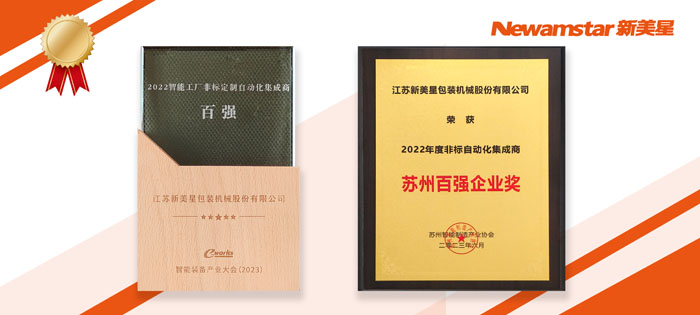 2023年6月3日, 2023中國新能源與智能裝備產業高質量發展大會在“最強地級市”蘇州隆重召開!與會嘉賓深入研討當前新能源與智能裝備產業面臨的機遇與挑戰,以及非標自動化的先進模式和先進理念,共同探索中國新能源與智能裝備產業高質量發展之路,并隆重舉行了“2022智能工廠非標定制自動化集成商百強榜”及“2022年度非標自動化集成商?蘇州百強企業獎”頒獎典禮。新美星左手“獎牌”、右手“獎杯”,好事成雙,雙喜臨門!