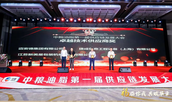 9月20日,中糧油脂第一屆供應(yīng)鏈發(fā)展大會(huì)在天津召開(kāi)。作為中糧集團(tuán)長(zhǎng)期以來(lái)的戰(zhàn)略合作伙伴,新美星憑借合作中展現(xiàn)出來(lái)的卓越品質(zhì)和優(yōu)質(zhì)服務(wù),被評(píng)為中糧油脂智能產(chǎn)線和倉(cāng)儲(chǔ)物流領(lǐng)域唯一的“卓越技術(shù)供應(yīng)商”。